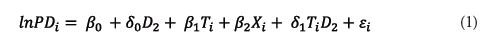 : representa o parâmetro de interesse da regressão. Mede a diferença do grupo de tratamento em relação ao grupo de controle após a ocorrência do evento (aplicação da Lei). É o efeito médio do tratamento, portanto, representa o estimador de diferenças em diferenças. Este coeficiente de interesse (estimador) pode ser expresso da seguinte forma:21