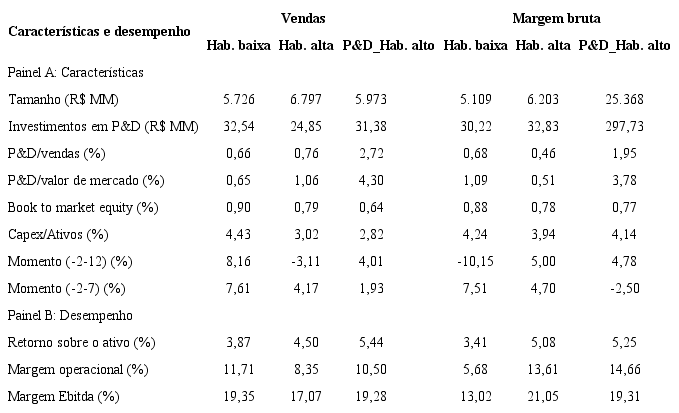 A Tabela 1 apresenta o sumário estatístico para portfólios formados em junho de cada ano t com base na habilidade para inovar, comparando-os com as características dos portfólios formados a partir do nível de intensidade inovativa (investimentos em P&D). A tabela mostra características e algumas medidas de desempenho dos portfólios de baixa habilidade para inovar, que contêm as empresas abaixo do 30o percentil do coeficiente de habilidade (γ ou δ), e os portfólios de alta habilidade, representados pelas empresas com coeficiente de habilidade acima de 70º percentil. Os portfólios P&D_Hab alto são formados pela intersecção entre as empresas que alcançaram os 30% maiores coeficientes de habilidade e aquelas localizadas entre os 30% maiores investimentos em P&D, representando as empresas com alto investimento em P&D e alta habilidade para converter tal investimento em vendas ou margem.