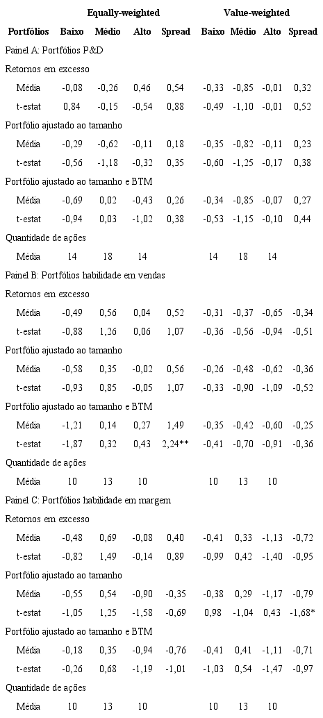 Analisando a Tabela 2, podemos observar que não é possível extrair qualquer padrão de retornos a partir da ordenação simples por P&D ou habilidade. Assim como em Silva et al. (2015), o Painel A indica que, tanto para os portfólios igualmente podendaros (equally-weighted) quanto para os aqueles ponderados pelo valor de mercado (value-weighted) não há qualquer associação significativa entre intensidade de investimento em P&D e retornos futuros, como pode ser visto na coluna spread, que representa o retorno de um portfólio comprado em ações de alta intensidade de investimento em P&D e vendido em ações de baixa intensidade.