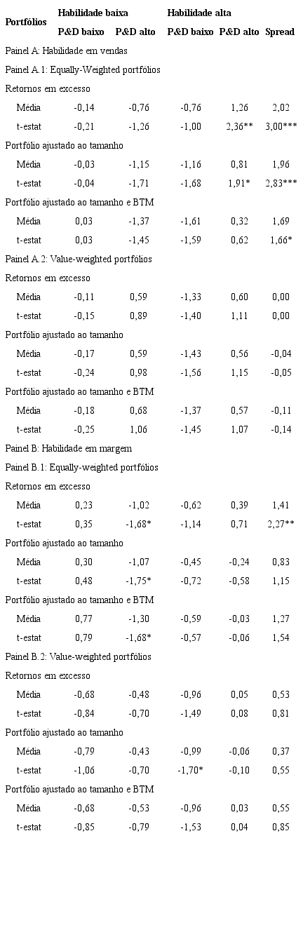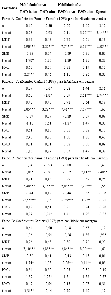Os resultados do painel C indicam que, para portfólios baseados na habilidade em margem-alto P&D, assim como para a estratégia baseada em habilidade em vendas-alto P&D, o modelo de três fatores apresenta retornos anormais positivos e significativos para os portfólios de alta habilidade-alto P&D e para o portfólio hedge, todavia, em menor magnitude e significância estatística. Para o portfólio hedge o retorno anormal foi de 1,42% ao mês (t=2,48) ou 18,44% ao ano, também em linha com os 18,30% ao ano obtidos por meio da formação de portfólios no painel B.1 da Tabela 3.
