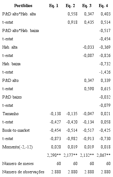 Em função das razões expostas na seção anterior, somente os coeficientes para os portfólios equally-weighted são apresentados na Tabela 4. Além dos coeficientes para os portfólios com baixa habilidade para inovar-baixo P&D, baixa habilidade-alto P&D, alta habilidade-baixo P&D e alta habilidade-alto P&D, a coluna spread apresenta os coeficientes para um portfólio hedge comprado em ações de alta habilidade-alto P&D e vendido em baixa habilidade-alto P&D. A estatística t foi calculada com base no erro padrão utilizando a metodologia de Newey e Kenneth (1987) para correção da heterocedasticidade e autocorrelação serial.