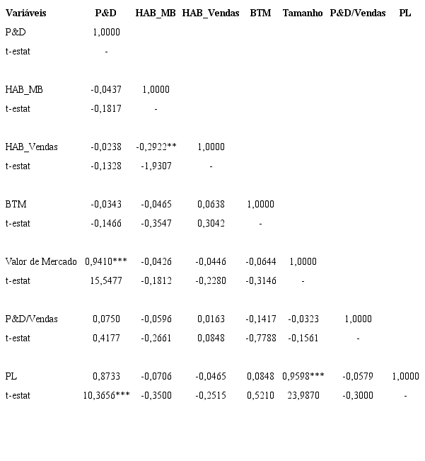 O investimento em P&D também se mostrou fortemente associado a empresas maiores, o que pode ser observado pelas altas correlações da variável com o valor de mercado e com o patrimônio líquido. A correlação entre as variáveis valor de mercado e patrimônio líquido também se mostrou elevada, devido ao fato de ambas serem uma referência ao tamanho da empresa. Observa-se, porém, que quando se considerou o investimento em P&D ajustado pelas vendas, a correlação com o tamanho não se mostrou significativa.