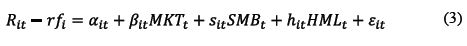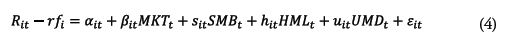 Além da formação de portfólios long-short, avaliou-se a existência de retornos anormais associados ao investimento em firmas com maiores coeficientes de habilidade para inovar e o mesmo nível de intensidade de P&D, por meio dos modelos de três fatores de Fama e French (1993) e Carhart (1997), conforme as equações 3 e 4, respectivamente.