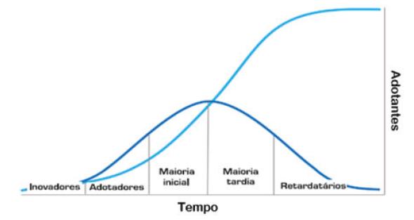O formato da curva é derivado do comportamento da adoção, que aumenta lentamente no início, quando apenas os inovadores a adotam, e acelera ao atingir os adotantes iniciais e a maioria inicial, o que representa a metade dos indivíduos previstos no sistema. Após, aumenta a uma taxa mais lenta, alcançando a maioria tardia e retardatária (ROGERS, 1962 apud NOGUEIRA-CAMPOS; GAMA; PINTO, 2008).