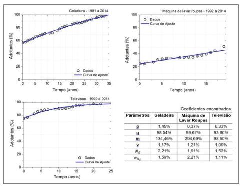 Os seis produtos foram agrupados em dois grupos: eletrodomésticos (os três primeiros) e Tecnologias de Informação e Comunicação (TICs) (os três últimos). Os seis produtos foram selecionados considerando o universo de bens duráveis investigados pela PNAD e os conjuntos de dados que apresentaram adoção ano após ano, para que o modelo pudesse capturar o processo de difusão. Além disso, para que a dinâmica apresentada fosse a mais completa possível, foram selecionados os seis produtos cuja série histórica dispunha de mais observações, levando em conta a introdução do produto no mercado. Por este motivo, as TICs selecionadas possuem séries históricas mais curtas, ao passo que o conjunto de eletrodomésticos possui séries mais longas. As curvas de difusão obtidas são aquelas que melhor se ajustam ao conjunto dos dados coletados. Para tanto, foi usado o método de mínimos quadrados3 e as curvas foram elaboradas com o software Origin 8.
