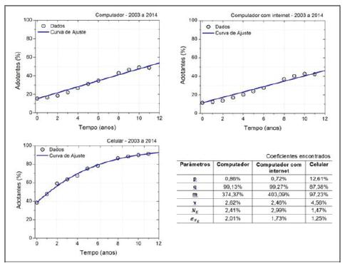 Ao analisarmos os coeficientes, observa-se que a relação entre (p) e (q) atende à condição ‘b’ citada no início do capítulo, pois o coeficiente de imitadores (q) é muito superior ao de inovadores (p), indicando que as curvas de difusão destes produtos possuem formato S. Comparando o último ponto da curva de difusão de cada produto com seus respectivos pontos de saturação (m), constata-se que o celular encontra-se próximo da difusão completa (no segmento final de suas curvas de difusão), enquanto o computador e o computador com internet estão em estágio intermediário. As velocidades médias (v) desses dois últimos produtos se assemelham, em torno de 2%, enquanto o celular apresentou velocidade maior, mais de 4%, para os coeficientes de inovadores. Identifica-se a predominância do celular em detrimento do computador e do computador com acesso à internet.