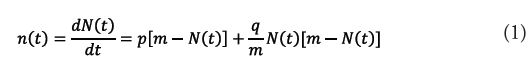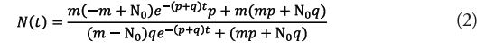 Onde é o coeficiente de inovadores; é o coeficiente de imitadores; é o número final de adotantes ou o ponto onde a difusão estará completa (ponto de saturação); é a fração de adotantes totais em cada instante de tempo e é a taxa de variação ou o número de novos adotantes em cada período. O termo representa as adoções dos inovadores e o termo corresponde às adoções dos imitadores. A equação (1) é uma equação diferencial ordinária de primeira ordem. Desse modo, dada a condição inicial , a sua solução é obtida via integração imediata e está exposta a seguir: