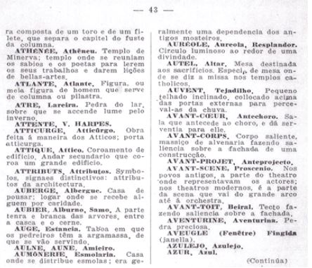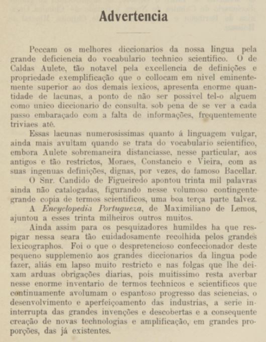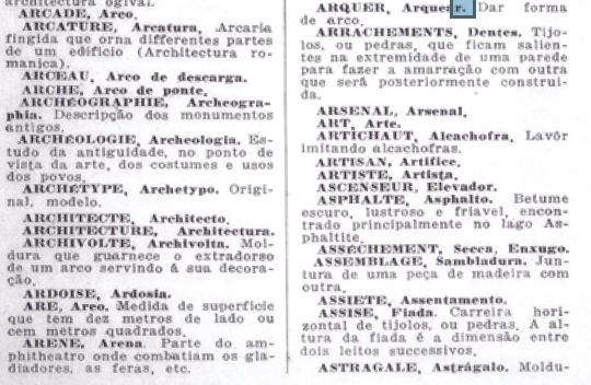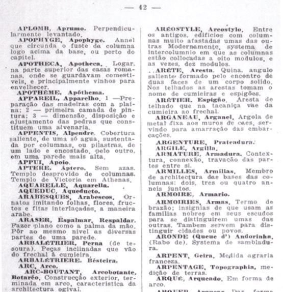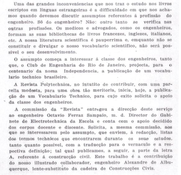 Embora seja possível apontar ações voltadas para inovação em diferentes momentos da história da instituição a partir da consolidação desse perfil, como os exemplos dos laboratórios acima deixam entrever, justifica-se a seleção de dois documentos textuais como indícios de tais aspectos pelo papel a eles atribuído no desenrolar dos conhecimentos. Todos se apresentam como referenciais, como balizadores de uma nova possibilidade, ao mesmo tempo exigente de novos saberes e novas ferramentas.13 O primeiro é a publicação na Revista Politécnica, de responsabilidade do Grêmio Politécnico, de um “Vocabulário Técnico” em vários números consecutivos, como um esforço coletivo de definir, de precisar o vocabulário empregado em livros técnicos, sobretudo estrangeiros, a fim de superar os inconvenientes da dificuldade de entendimento. Assumiu o vocabulário sobre construções civis o professor então recém-contratado, egresso do curso de engenheiro arquiteto, Alexandre Albuquerque (1860-1940).14