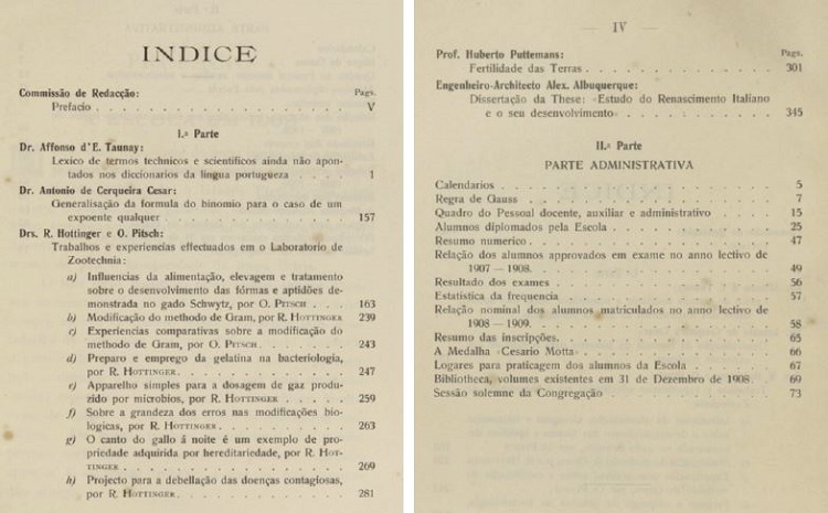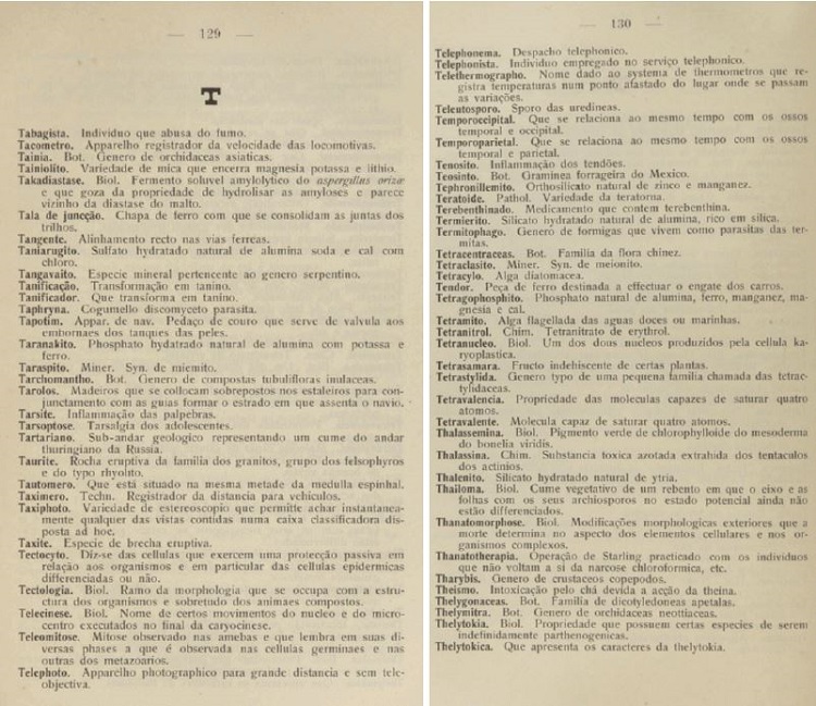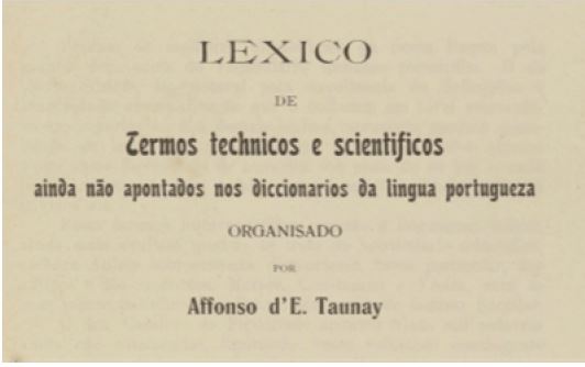 O segundo léxico foi publicado por Afonso Teixeira d’Escragnole Taunay (1876-1958), engenheiro civil formado na Politécnica do Rio de Janeiro em 1900, e dedicou-se posteriormente aos estudos de historiografia, destacando-se com pesquisas sobre o bandeirismo paulista e o período colonial brasileiro. Como engenheiro foi professor de química na Escola Politécnica e posteriormente na Faculdade de Filosofia, Letras e Ciências Humanas da USP. O léxico reproduzido aqui reúne quantidade impressionante de verbetes, mais de cinco mil, que, segundo justifica, constituem lacuna importante nos dicionários da língua portuguesa em questões técnicas e científicas. Foi publicado no Anuário da Escola Politécnica para o ano de 1909, junto a outras contribuições dos docentes da escola, conforme se acompanha no sumário, reproduzido como exemplo do perfil das produções anualmente publicadas pela Politécnica.15