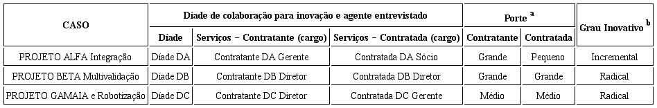 Nos 3 (três) casos identificados e confirmados, a díade de colaboração foi composta por duas empresas de serviços; a primeira caracterizada como contratante e a segunda como contratada. A empresa de serviços contratante (cliente) foi a idealizadora da inovação e detentora de conhecimentos específicos de negócios. Entretanto, a contratante dependia de conhecimentos complementares especializados da empresa de serviços contratada para a realização do projeto inovador. O aporte explícito (e exposto) de conhecimento a ser combinado de ambos os partícipes das díades foi um aspecto fundamental na caracterização da colaboração (fenômeno de interesse), diferenciando a relação estabelecida nos projetos inovadores estudados do simples fornecimento de produtos ou serviços na forma não transformada. Os três projetos inovadores selecionados para o estudo de múltiplos casos são sumarizados no Quadro 1.