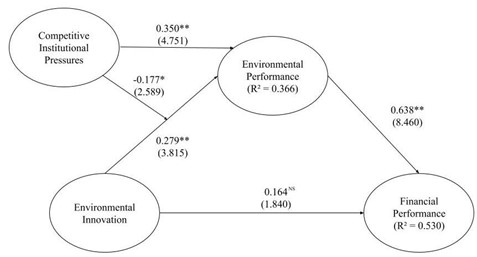 To explore the proposed hypothesis of this work, we performed the PLS path modeling analysis in the structural model. This method uses a bootstrapping procedure to calculate significance levels for each path in the model. The path coefficients of constructs relationships (direct, moderating, and indirect effects), statistical significance, and the explained variance of endogenous constructs (R2) are shown in Figure 1. As R2 states the amount of variance in a construct that is explained by the exogenous measures in the model, the analysis indicates that both environmental innovation and competitive institutional pressures accounted for 36.6% of the variance in the environmental performance construct. Further, environmental innovation and environmental performance explained together 53% of the total variance of financial performance.