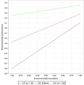 Considering the path coefficients in the model, the findings indicated that environmental innovation had a positive relationship with environmental performance (β = 0.279, p < 0.01, t=3.815); however, its impact on financial performance was not significant (β = 0.164, p > 0.05, t=1.840). Competitive institutional pressures also had a positive influence on environmental performance (β = 0.350, p < 0.001, t=4.751). The findings also highlighted a significant negative interaction effect between environmental innovation and competitive institutional pressures on environmental performance (β = -0.177, p < 0.01, t=2.589). For a better understanding of this interaction, a simple slope analysis was performed (Figure 2). The analysis demonstrates the negative interaction between these two constructs: for companies at lower levels of competitive institutional pressures, environmental innovation has a stronger influence on environmental performance, whereas this effect is attenuated at higher levels of the proposed moderator. Further, the results indicated that environmental performance had a positive effect on financial performance (β = 0.638, p < 0.001, t=8.460).