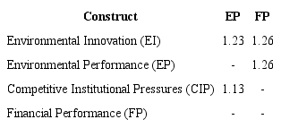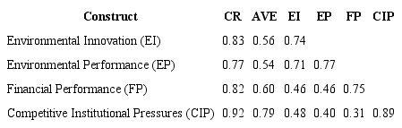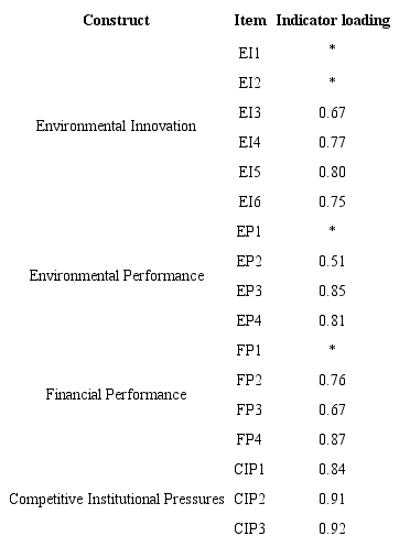 The variables investigated in this work, namely environmental innovation, environmental performance, financial performance, and competitive institutional pressure, were based on the validated scales from Li (2014). Environmental innovation measures examined the extent to which companies had practices (EI1), certifications (EI2), cross-functional cooperation (EI3), product development (EI4 and EI5), and waste management (EI6) aimed to improve environmental outcomes. Environmental performance measured reduction in waste emissions (EP1), harmful substances (EP2), frequency of environmental accidents (EP3), as well as improvement of company environmental image (EP4). Financial performance assessed the improvement of capacity utilization (FP1), decrease in penalty costs for environmental accidents (FP4) and fees for waste treatment (FP2), as well as profit increase due to the selling of scrap and used equipment (FP3). Finally, competitive institutional pressure evaluated the extent companies resorted to the green concept to create a competitive advantage over competitors (CIP1, CIP2, and CIP3).