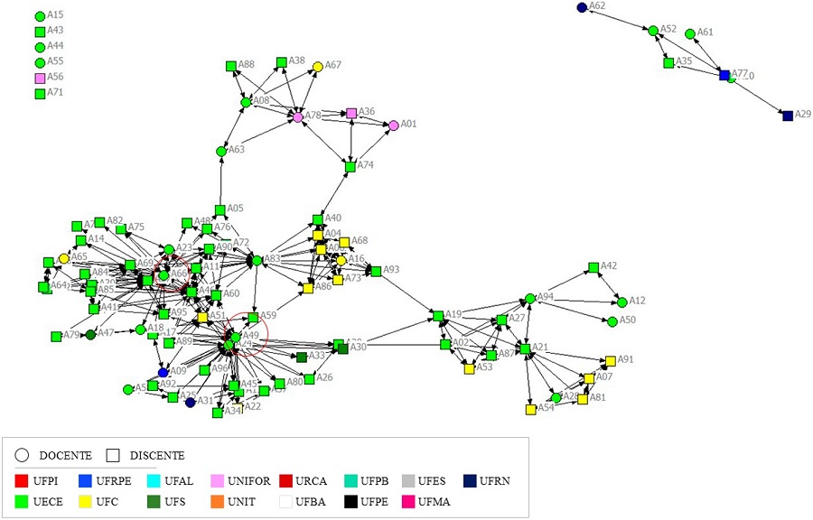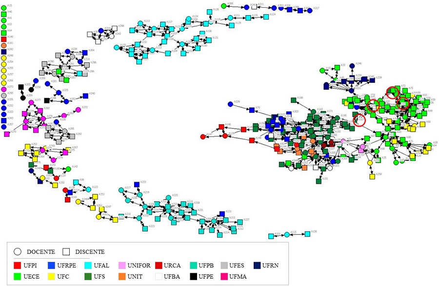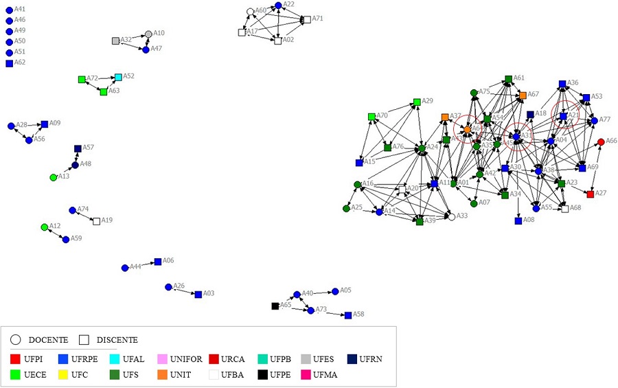 The formation of several connections by these actors showed different flows in their research relationships, especially researchers linked to UECE, UFS, and UFRPE focal points, in addition to UFC focal point and UNIFOR, associated to UECE focal point, who intermediated and centralized many connections.