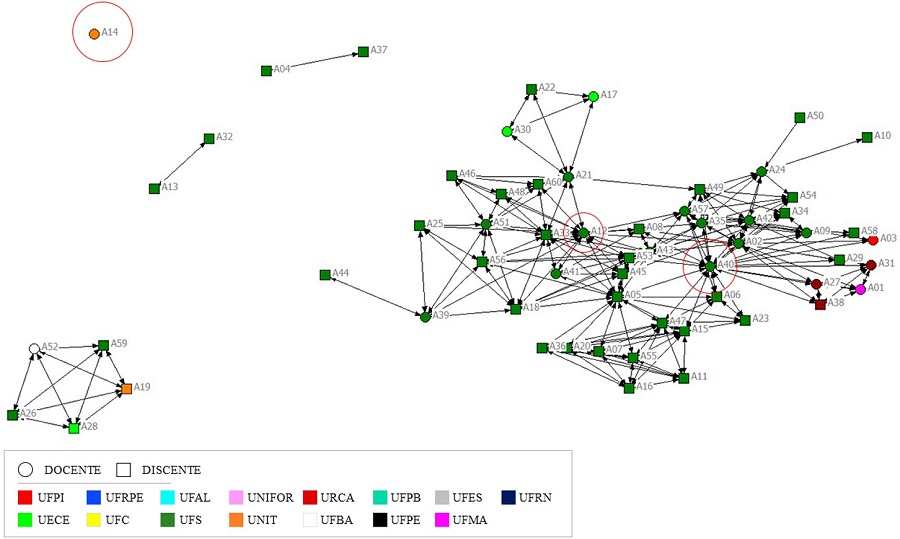 The analyzed data show that UECE has the lowest level of density among all focal points examined, of 5.7%, explained by its extensive pool of actors (MACHADO, 2012). Regarding the degree of centrality, actor A40, professor at UFS focal point, has the highest degree of centrality compared to the other actors of this focal point, which shows his/her high relevance in research relationships, confirming Machado (2012).