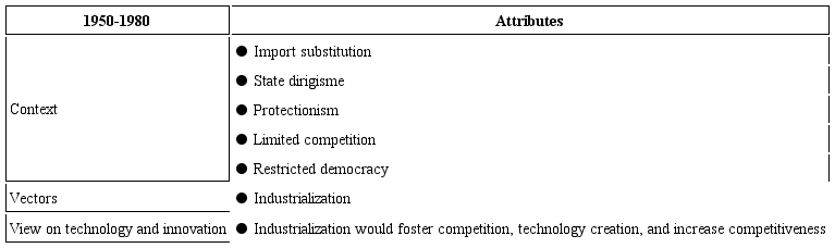 However, in neither of these stages did the country gave priority to technology and innovation as driving forces for economic development (TURCHI; MORAIS, 2017; VIOTTI, 2008); hence, there was no planning of public policies for promoting Science, Technology and Innovation (S,T&I). Table 1 shows some policies that guided the Brazilian economic development model.