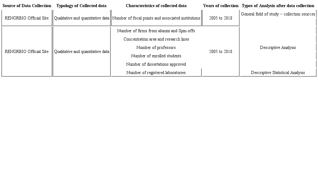 STAGE 1 – Search for data made available by the coordinators of the Program’s focal points: this stage involved information search at RENORBIO official website, in addition to sending letters and e-mails to coordinators, in order to receive statistics regarding the internal surveys on the number of articles, patents, and spin-off creation in the Network.