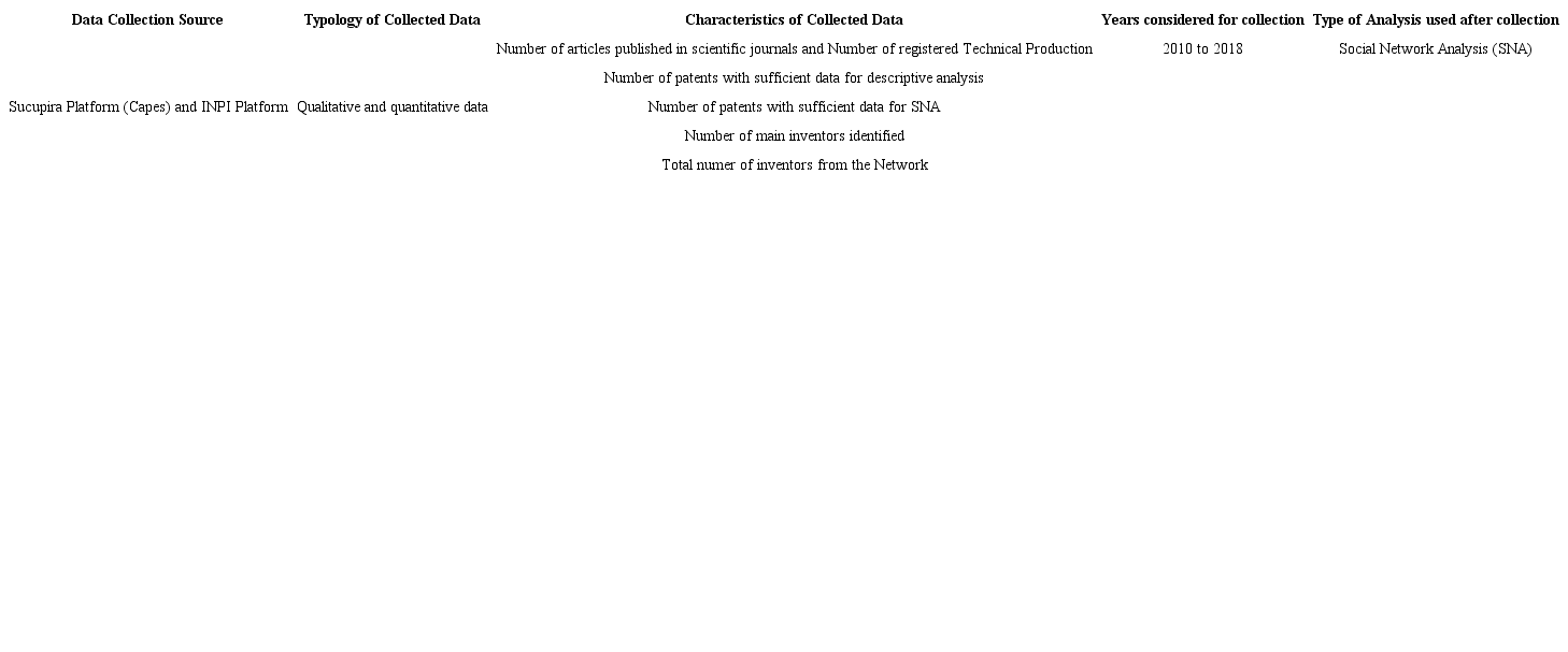 Data collection stage comprised searching information on scientific production (articles, books, reports), technical production (patents), and records of spin-offs resulting from research developed in the 13 focal points: State University of Ceará (UECE); Federal University of Ceará (UFC); Federal University of Sergipe (UFS); Rural Federal University of Pernambuco (UFRPE); Federal University of Pernambuco (UFPE); Federal University of Alagoas (UFAL); Federal University of Rio Grande do Norte (UFRN); Federal University of Maranhão (UFMA); Federal University of Piauí (UFPI); Federal University of Paraíba (UFPB); University of Tiradentes (UNIT); Federal University of Bahia (UFBA); and Federal University of Espírito Santo (UFES).