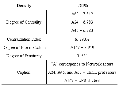 The configuration of the relationships among the actors linked to RENORBIO shows a density level of 1.2%, which is a low figure, given the general level of connection of the agents (Table 4), as observed by Otte and Rousseau (2002). In addition, the low density identified confirms Machado (2012), that the larger the network, the lower the link density among its agents. Regarding the degree of centrality, actor A60, professor at UECE focal point, has a higher figure than actors A24 and A46, also professors at the same focal point, which shows his/her extreme importance for RENORBIO's research relationships (MACHADO, 2012).