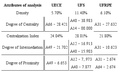 UECE showed relationships among 96 network’s internal actors, that is, the formation of 96 interaction nodes, resulting from collaborative research, led to filing 87 patents considered for this analysis. UFS, in turn, revealed relationships among 60 internal actors, through collaborative research, which resulted in 35 patents filed, considered for this analysis. In addition, UFRPE showed relationships among 77 actors within the network, which resulted in filing 56 patents considered for this analysis.