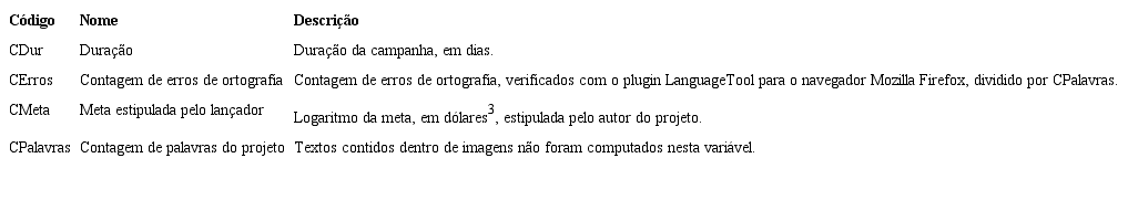 A variável dependente é o sucesso ou fracasso da campanha de financiamento dos projetos em exceder a meta e as variáveis explicativas selecionadas para este estudo baseiam-se em Mollick (2014) e Koch e Siering (2015), adaptadas para o estudo dos jogos eletrônicos. Foi utilizada a divisão em blocos de variáveis proposta por Koch e Siering (2015), sendo aqui efetuada nos seguintes blocos: técnico, artístico, projeto e controle. Como princípio geral, é esperado que a disponibilidade de informações e recursos dos projetos aprofunde a comunicação entre lançador e apoiador, informando a decisão de apoiar um projeto e contribuindo para o êxito da campanha, especialmente com o uso de recursos multimídia para apoiar o material em texto (KOCH; SIERING, 2015). As variáveis explicativas estão relacionadas nos Quadros 1 a Quadro 4.