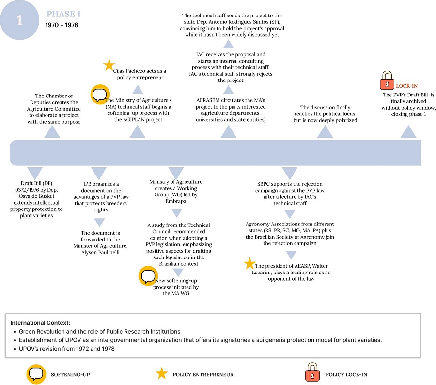 The analyses of the development of the Brazilian PVP Act usually focus on the political discussion carried out in the 1990s (ROCHA, 1997; CARVALHO; SALLES FILHO; PAULINO, 2009; ARAUJO, 2010; BOFF, 2019). However, studies such as the one by Velho (1995) demonstrate a political path that had already started decades before, in the 1970s. Velho (1995) argues that the political discussion that culminated in the development of the PVP Act had been a longstanding debate that can be divided into two phases: the 1st phase of controversy, which dated from 1970 to 1978, and the 2nd phase of controversy, which started in the 1980s and ended with the promulgation of the PVP law, which instituted the PVP Act, in 1997. From these phases it was possible to find lock-in conditions within the debates, and a learning process from the actors’ previous political choices.