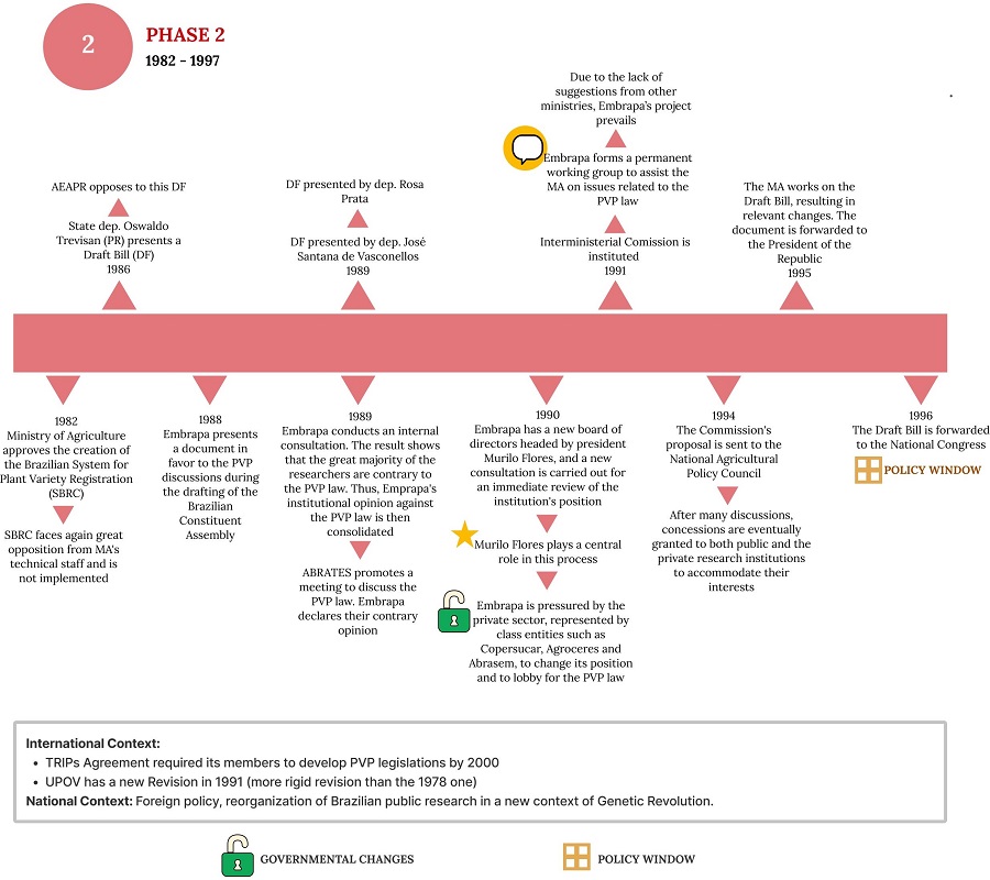 It is noteworthy that the whole drafting process was carried out in the midst of ideological conflicts, as argued by Velho (1995) and Araujo (2010). An opportunity emerged when national, international, economic, and political paths converged, thus creating a policy window. Interestingly, the actors and the political discussion were stable throughout the almost three decades of plant breeding legislation drafting.