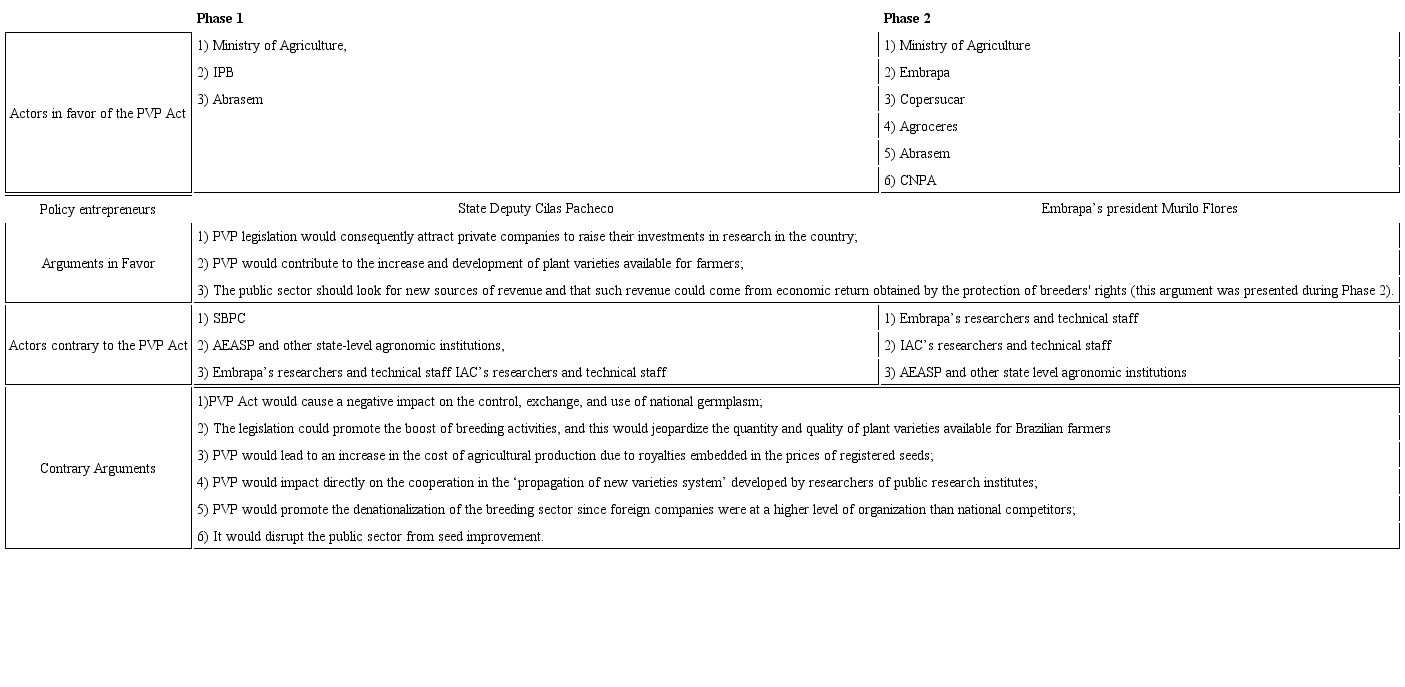 Our hypothesis is that the PVP Act drafting, far from being centered on a discussion of agricultural and technical-scientific matters, has been a political process eminently based on the dynamic articulation of few actors who dispute interpretations in accordance to their own interests about whether signing the PVP Act was needful (or not). This study will fill an analytical gap in PVP discussions since the literature mostly relies on technical arguments about plant variety legislation without considering the influence that political forces have in this kind of process. They acted not only in the past, in instituting the PVP Act in Brazil, but they continue today, as attempts towards changing the law have still been made. By performing an ex post analysis of the agenda setting of the PVP Act in Brazil, we provide relevant information on strategies and dynamics of actors that can impact the political discussions about the changes in the PVP Act today.