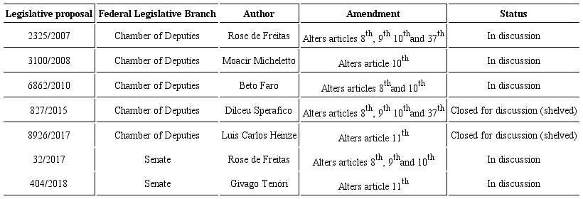 The process of questioning the PVP Act is now represented by five draft bills submitted to the Chamber of Deputies over the past 20 years and two draft bills submitted to the Senate. The legislative proposals presented in Table 2 translate the private interests of agricultural institutions and technical-scientific approaches that are under 1991 UPOV. They still focus on privatization of knowledge and grants of exclusive rights to breeders. Opposition is still strong defending national seed production and more economic democracy, and continues postponing discussions or shelving legislative proposals.