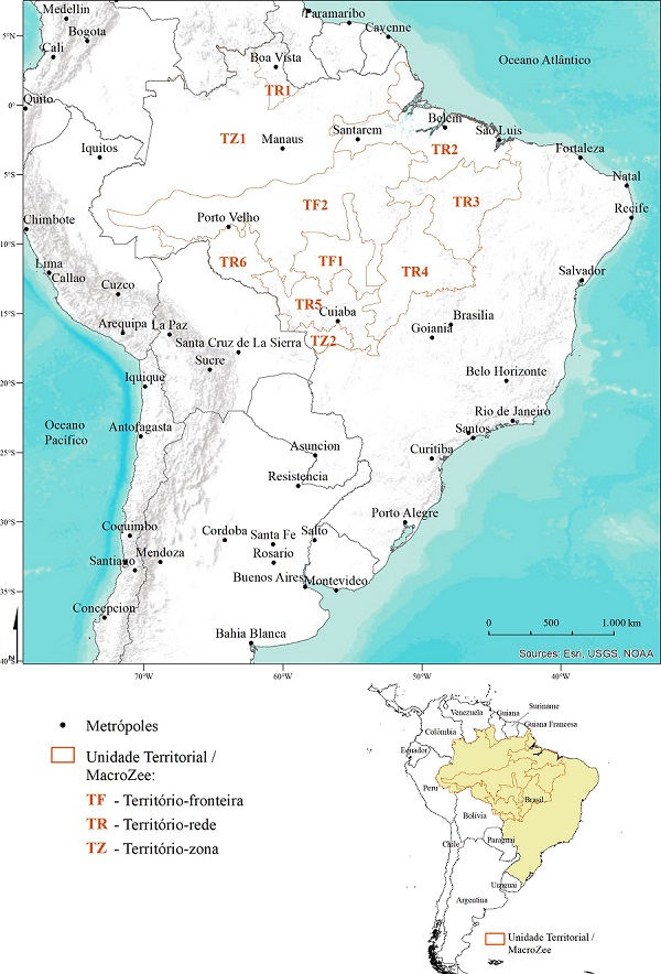 Considerando as especificidades territoriais e a “[...] densidade de diferentes tipos de redes e fluxo” (BRASIL, 2010, p. 35), o MacroZEE identifica dez unidades na Amazônia Legal: seis territórios-rede, dois territórios-fronteira e dois territórios-zona (BRASIL, 2010, p. 42) (Figura 1).