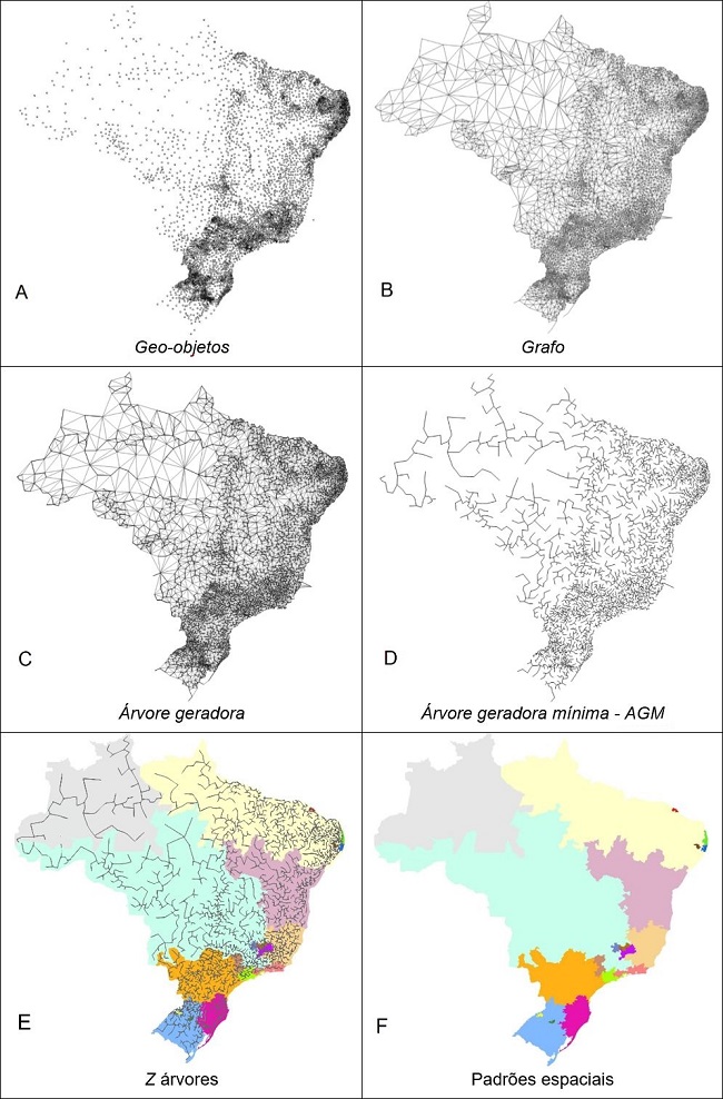 À medida que se removem as arestas da AGM, um conjunto de árvores desconectadas aparece até se atingir o número de agrupamentos previamente estipulado a partir da avaliação, a cada partição, da variação dentro dos agrupamentos da soma de quadrados dos desvios. Dessa forma, o espaço nacional passa a ser apresentado em agrupamentos disjuntos e complementares que contam com o maior grau de homogeneidade interna possível (Figura 2F).