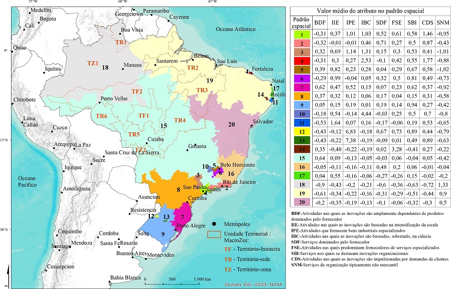 Ao se sobreporem as unidades territoriais estipuladas no âmbito do MacroZEE (Figura 1) aos recortes dos padrões espaciais revelados (Figura 3), é possível, a partir das interseções, associar àquelas as características desses padrões. Evidencia-se assim que os territórios TR1 e TZ1 correspondem ao padrão 18; os territórios TF1, TF2, TR4, TR5, TR6 e TZ2, ao padrão 15; o TR2, ao padrão 19; o TR3, simultaneamente, ao 19 e ao 20 (Figura 3).
