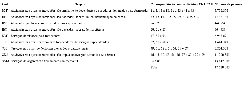 O deslindamento de tais padrões espaciais envolveu a utilização de tipologia elaborada por Robinson et al. (2003), derivada da classificação de padrões de inovação para a produção industrial desenvolvida por Pavitt (1984) e da tipologia sobre inovação em serviços elaborada por Van Ark, Broersma e Den Hertog (2003). Trata-se de classificação que considera a “[...] crucial dependência da relação entre os insumos (relacionamento com o fornecedor), a empresa cliente ou consumidor final (relacionamento com o cliente) e a natureza da inovação processada dentro da própria empresa” (ROBINSON et al., 2003, p. 62). A tipologia baseia-se na caracterização dos grupos de atividade econômica e do papel desempenhado por cada um deles como fontes de inovação, envolvendo a identificação de atividades que comportam capacidades distintas para impulsionar a interação e a cumulatividade na relação entre processos produtivos e inovações. A tipologia comporta nove grupos de atividades econômicas, conforme apresentado na Tabela 1.