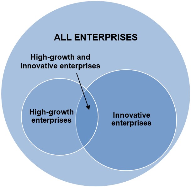 Figure 1, a representative diagram of enterprises according to their attributes regarding high growth and innovation, presents an easy way to grasp the concept of DINNOV. Among all enterprises, represented by the larger circle, there are two smaller circles representing innovative and high-growth enterprises. The intersection of these smaller circles depicts enterprises that are simultaneously innovative and high-growth. The DINNOV indicators are measurements of the proportional contribution of the set of enterprises in that intersection to all enterprises in terms of number of enterprises, number of employees and value added.