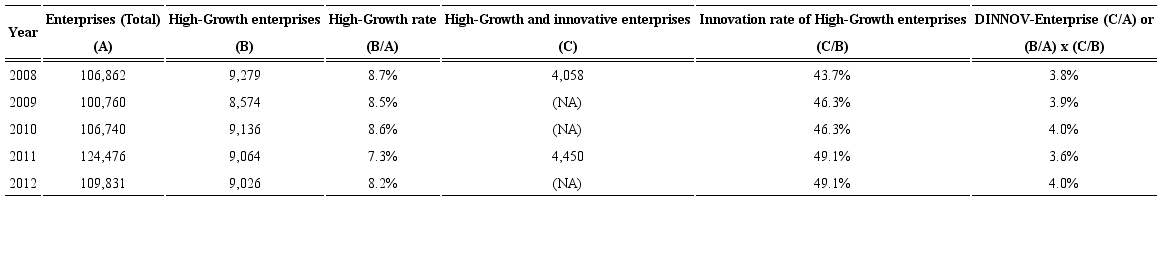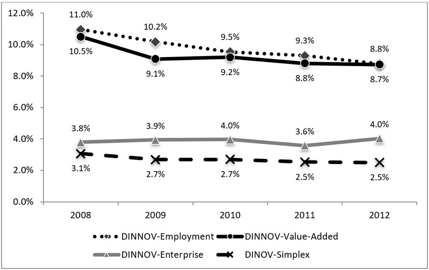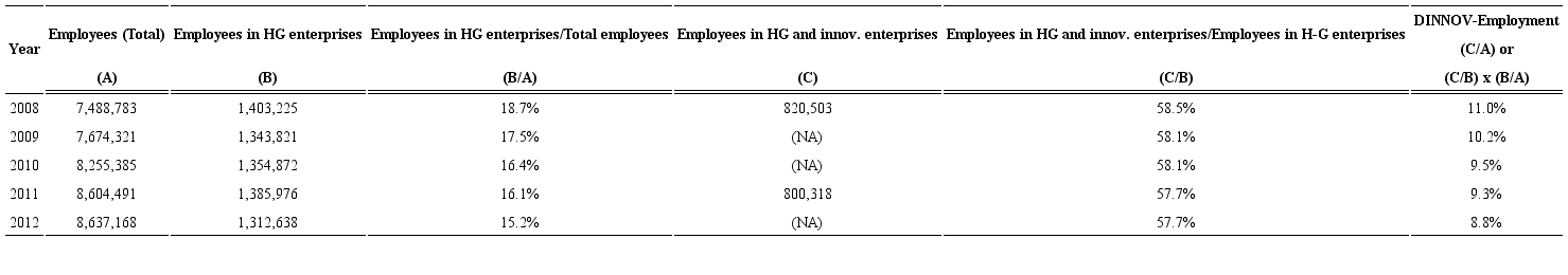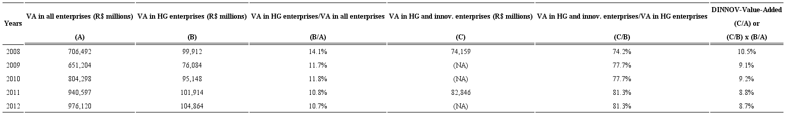 Following the methodology described above, the main results achieved by the process of estimating the values of indicators DINNOV-Enterprise, -Employment and -Value-Added for Brazil during the years 2008 to 2012 are presented in Tables 1, 2 and 3.9Table 1 presents the estimates of the number of all enterprises and of the subsets of innovative, high-growth, and simultaneously innovative and high-growth enterprises. The last column of Table 1 presents the proportion of innovative and high-growth enterprises in the total number of enterprises, which is the same as the DINNOV-Enterprise indicator. Table 2 presents the estimates of the number of employees in high-growth, in high-growth and innovative, and in all enterprises. The last column of Table 2 presents the proportion the number of employees in innovative and high-growth enterprises represents in the number of employees in all enterprises, which is the same as the DINNOV-Employment indicator. Table 3 presents the estimates of the value added in high-growth, in high-growth and innovative, and in all enterprises. The last column of Table 3 presents the proportion value-added in innovative and high-growth enterprises represented in the value-added in all enterprises, which is the same as the DINNOV-Value-Added indicator.10