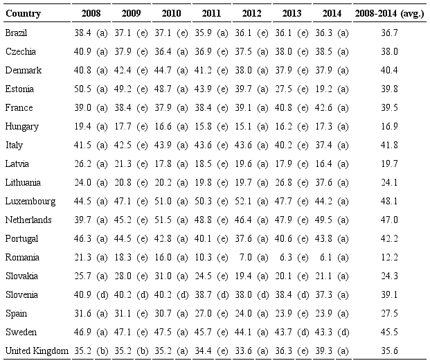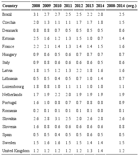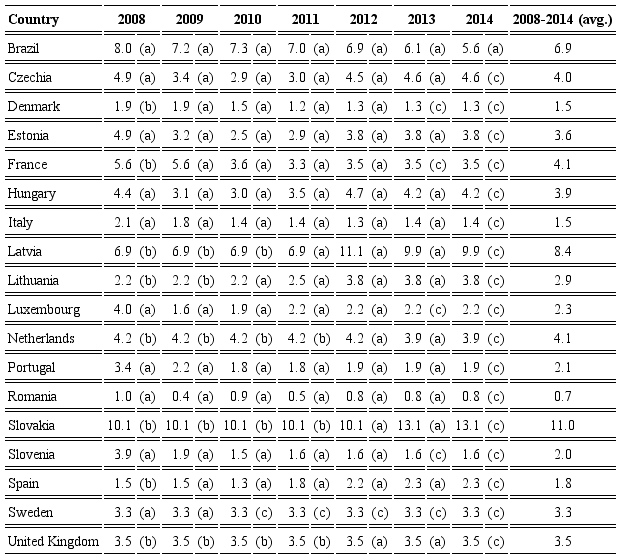 Estimates of the DINNOV-Simplex for Brazil and 17 selected European economies for the period 2008-2014 are shown in Table 4. The values of these rates are shown in Tables A1 and A2 in the Annex to this article.