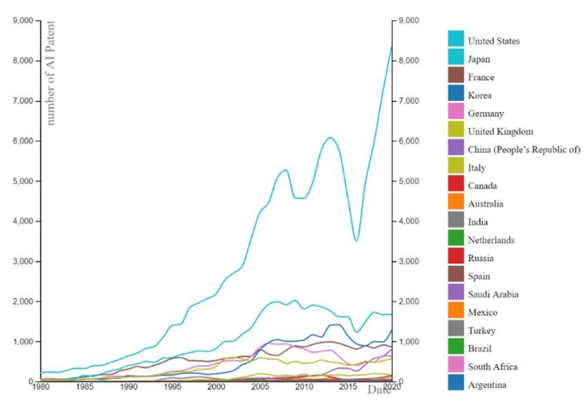 In the case of the race for AI, the leadership position of the United States derives not only from the country's capacity for innovation but also from the diversity of policy instruments that the government designs to achieve outcomes in global terms of patents and technological domination.