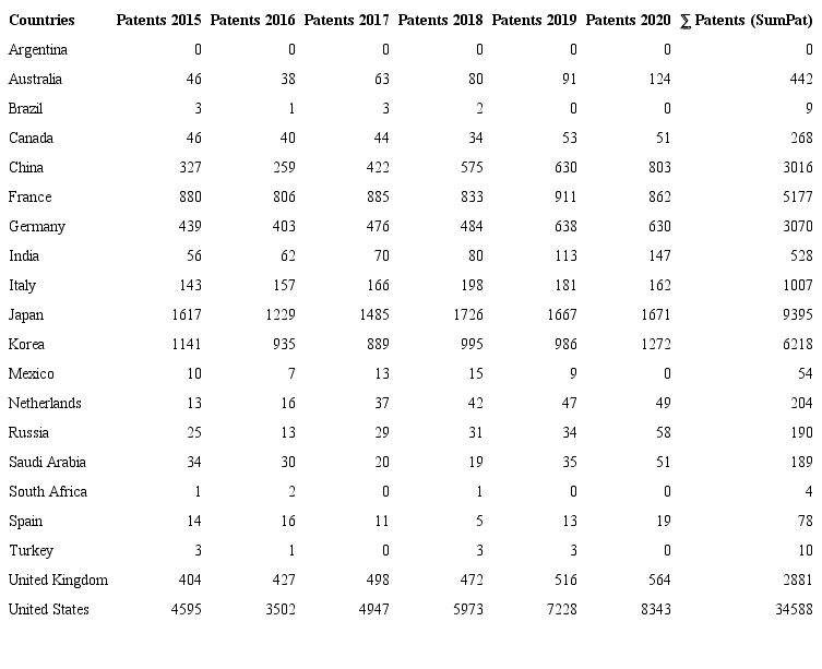 Data from this outcome indicate a deep gap between the G20 countries (see Figure 1). Inequalities between countries regarding patent registration are derived from different institutional frameworks. Data were collected concerning patents published between 2015 and 2020. The data on patent registration was normalized using the sum of patents published in this time frame. Having made this sum, the distribution of patents among the G20 countries was calculated by extracting the square root of the sum of patents in each country, divided by the number of patents with the maximum distribution. Normalization was achieved with the following formula: