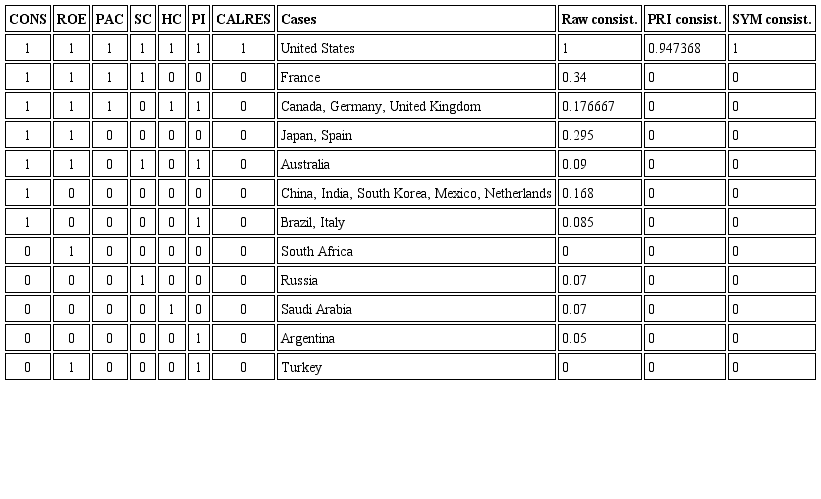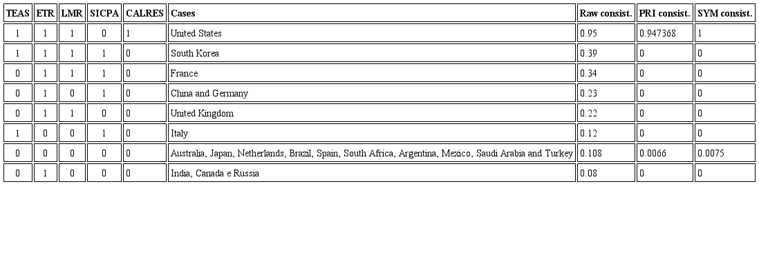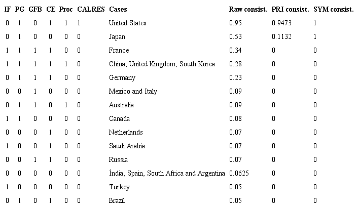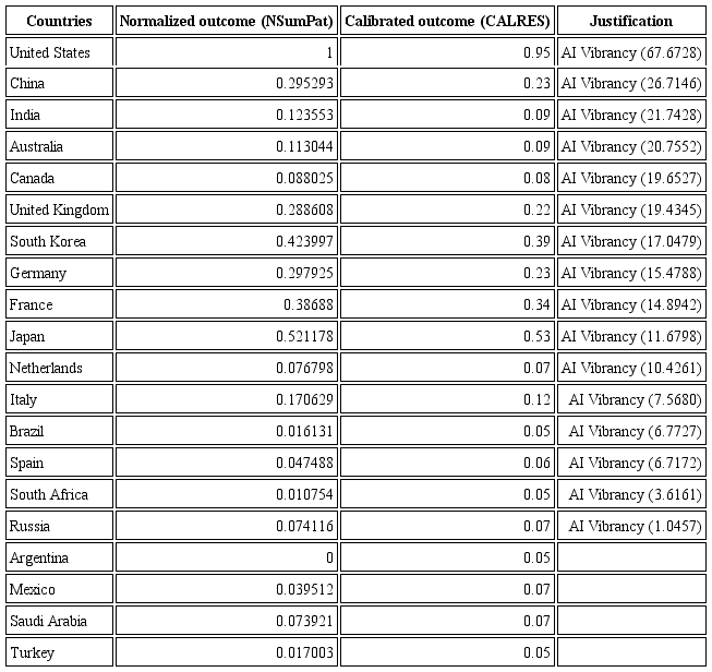 Calibration was performed automatically by the fsQCA 3.0 software. In addition to the calibration of normalized data, we compared the calibrated result, considering the scope and presence of countries in the production of AI patents. The cuts were confirmed, considering the qualitative assessments of the Stanford University AI Vibrancy Index to justify the choices made in Table 2.3 As the QCA method is qualitative, it requires a theory that allows the calibration process to be coherent. Confronting the calibrated outcome with the AI Vibrancy Index serves as an element to confirm the calibration process, which is required by the QCA method. The justification for this is to consider the extension of patent production and the insertion of AI technologies, according to the insertion and motivation captured by AI Vibrancy regarding the AI development. This vibration, captured by the index, consists of the dimensions of research and development, hiring, labor market expansion with AI, ethical challenges, education and training in AI, inclusion, and national strategies. The cases of Argentina, Mexico, Saudi Arabia, and Turkey were not confirmed with the AI Vibrancy Index. Although they are members of the G20, there is no data on them in the AI Vibrancy Index research.
