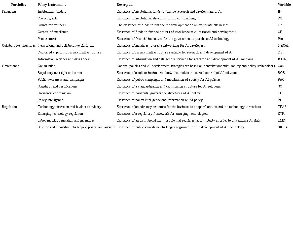 This set of conditions represents portfolios of AI policy instruments, aiming at a digital transformation process that encompasses markets, industry, and governments. The instruments introduced in Table 3 comprise four related portfolios for AI development. Within each of these portfolios, we have a set of objectives associated with conditions that reflect a comprehensive understanding of AI policies recognized in the literature. The analysis of the sets of these conditions allows us to understand which combination of instruments produces outcomes in the AI development.