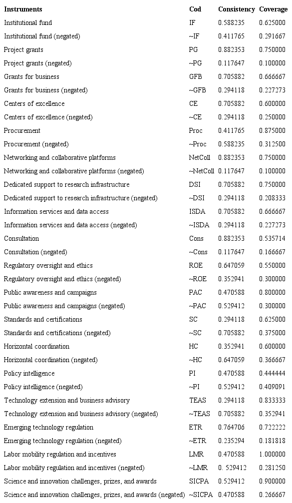 The results achieved in this research comprise the comparison of the sets of policy instruments and how they explain the set of patents produced between 2015 and 2020. The first requirement of the QCA method is to test the necessary and sufficient conditions relating instruments with AI policy outcomes in the G20. Table 5 presents the analysis of consistency and coverage for each instrument, as well as the set of negated instruments. In this case, the analysis of the necessary conditions allows affirming that the presence of certain policy instrument is condition for the outcome to be present.