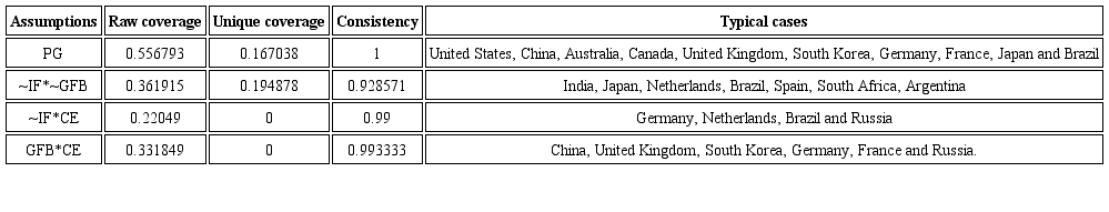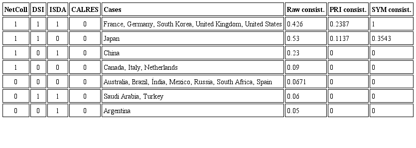 The existence of portfolios of collaboration instruments represents the necessary conditions to produce AI patents, especially collaborative networks and platforms (Table 5). The portfolios of collaborative frameworks are intended to strengthen developer networks and build operational support for research and development. Analyzing the truth table about collaborative structures aims to understand how countries organize their collaborative instruments and what configurations are necessary conditions to explain the outcome.