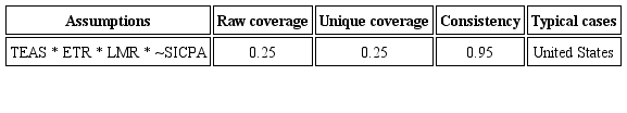 The intermediate solution presents (Table 13) the consistency and empirical interest for analyzing regulatory instruments. To produce AI patents, the combinations of technology extension and business advice (TEAS), emerging technology regulation (ETR), and labor mobility regulation and incentives (LMR) introduce the best outcomes. This result suggests that the regulation of emerging technologies and policies that deal with changes in the labor market produce outcomes in AI patents. Common to these two solutions is emerging technology regulation (ETR) as an essential topic for AI policy. Similar to the analysis of previous portfolios, the United States has a greater diversity of instruments, enabling the acceleration of research and development with regulation aimed at the extension of technology in the industry, creation of incentives for training and mobility of human capital and associated themes with the regulation of emerging technologies, such as data governance, control models and development platforms.