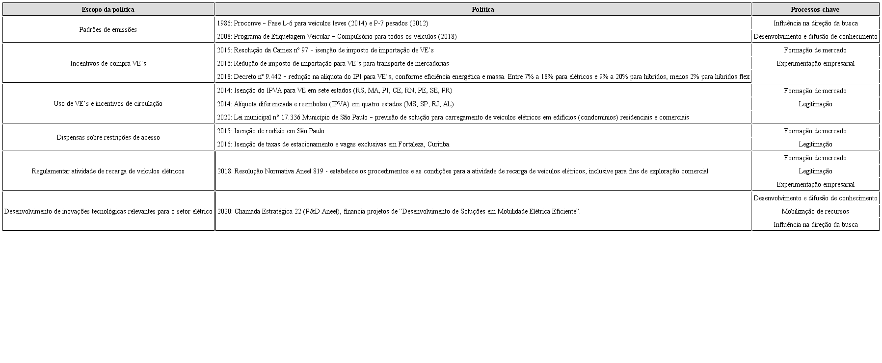 Em relação a infraestrutura institucional, que aqui nos interessa diretamente, cabe ressaltar a elaboração de duas recentes políticas setoriais automotivas e outras políticas relacionadas à mobilidade elétrica, incluso o programa nacional de controle da poluição do ar. Todavia, como será visto a seguir, trata-se de políticas que, em diversos aspectos, encontram-se fracamente alinhadas com as propostas de implementação de automóveis elétricos, ou, até mesmo, atuando como mecanismos de bloqueio aos processos-chave necessários para o desenvolvimento da tecnologia em questão.