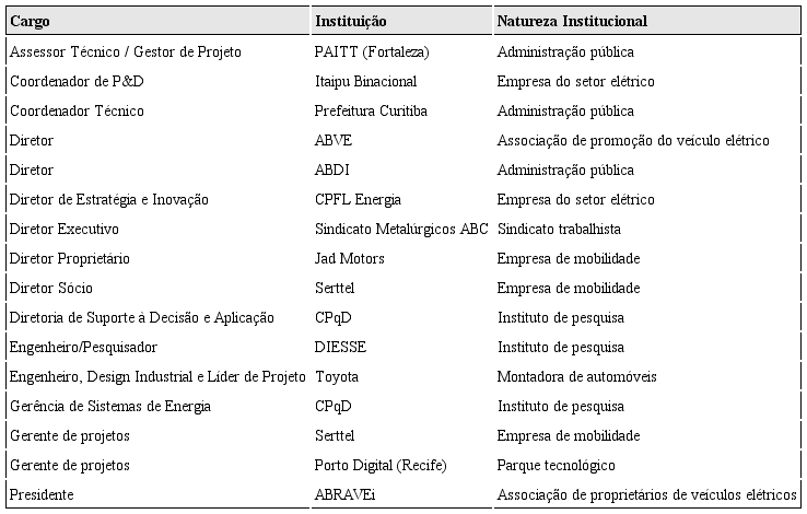 As referidas redes são formadas, em sua maioria, por atores externos ou secundários ao mercado automotivo, como empresas do setor elétrico, fornecedores de equipamentos elétricos, associações civis de consumidores, institutos de pesquisa e administrações públicas subnacionais. Tais iniciativas derivam, em geral, de projetos de pesquisa e de projetos pilotos, voltados para a exploração e demonstração tecnológica do automóvel elétrico. Entre essas, destaca-se o Projeto Veículo Elétrico (VE) da Itaipu, o Projeto Ecoelétrico Curitiba, o Sistema de Compartilhamento de Elétricos Vamo Fortaleza, o Projeto Emotive da CPFL Energia, além de algumas startups de veículos elétricos de baixa velocidade, como HITECH, Electric Dreams, Mobilis, JAD Motors e Grilo Mobilidade.