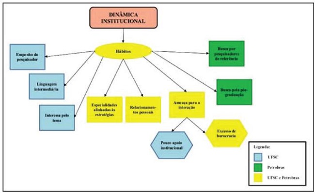 A identificação dos hábitos da interação UFSC e Petrobras, exposta na Figura 1, compõe parte da dinâmica institucional em estudo. Os principais hábitos desta parceria citados pelos coordenadores da UFSC correlacionam-se à importância do relacionamento pessoal e confiança dos pesquisadores da UFSC e colaboradores da Petrobras; interesse da empresa pelo tema pesquisado; linguagem utilizada entre empresa e Universidade; empenho do pesquisador; e ameaça para a interação (burocracia). Para os gerentes da Petrobras, os principais hábitos são a busca por pesquisadores de referência no tema de interesse da empresa, os quais apresentam especialidades alinhadas às suas áreas estratégicas; busca pelos programas de pós-graduação ligados aos pesquisadores que fazem parte dos projetos de P&D; presença de relacionamentos pessoais, baseados na confiança mútua; e ameaça à interação pelo excesso de burocracia dos órgãos de controle.