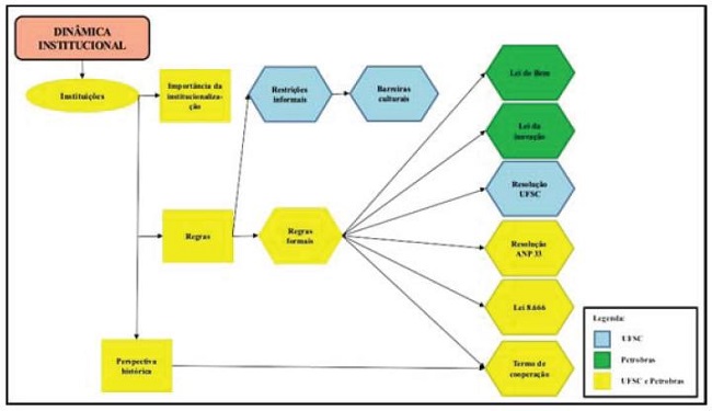 A burocracia, expressa através de procedimentos e regras, gera hábitos de comportamento, que se manifestam na interação U-E. Esta constitui como algo enraizado, influenciando rota de desenvolvimento constituída ao longo dos anos. Nessa perspectiva, a institucionalização da interação UFSC e Petrobras possibilitou definição clara de quais são os caminhos a serem seguidos, requerimentos a serem atendidos, prazos contratuais entre outros procedimentos, conduzindo os pesquisadores a um comportamento coletivo, que seja institucionalizado e não prescinda apenas de relações pessoais. Nesse sentido, as instituições são vistas como agentes de mudança e são essenciais na criação de um contexto adequado para o avanço tecnológico e à continuidade do crescimento econômico (CASTELLI; CONCEIÇÃO, 2014).