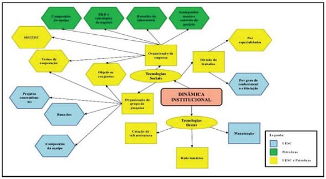 O aprofundamento da análise da dinâmica institucional perpassa pela compreensão dos conceitos de tecnologia física e de tecnologia social, propostos por Nelson (2006, 2008). Dentre as “tecnologias físicas”, citam-se a criação e a manutenção de infraestrutura (prédio, mobília, laboratório, equipamentos, computadores, projetos, entre outros), que consolidaram o processo de interação com a UFSC que garantem a realização de pesquisas por longo prazo. Destacam-se ainda as redes temáticas, as quais são desenvolvidos de forma colaborativa entre as instituições reconhecidamente competentes nos temas selecionados, o que favorece o desenvolvimento tecnológico decorrente de novos projetos.