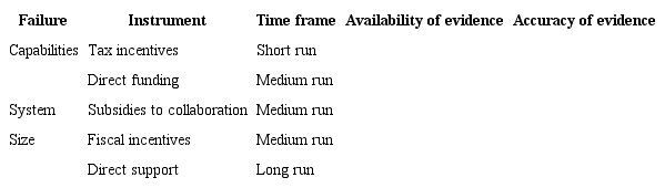 Policies to deal with capability failure are the interventions most supported by evidence from policy instruments. Evaluations show that R&D tax incentives and direct funding increased business R&D expenditure over time (input additionality). There are positive effects of R&D tax incentive on output additionality, especially for products and processes, but the evidence for direct funding is limited and contradictory. In both cases, these effects vary greatly depending on the country, sectors, period and method used. Therefore, this context-dependent characteristic of the instruments makes careful examination necessary before their implementation in latecomers since most of the evidence comes from developed countries.