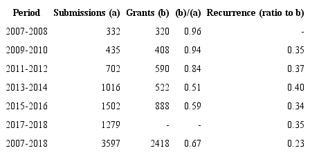 We defined a firm as recurrent if it has at least one finished granted project in t and t-1 (Table 1). Under this definition, between 33% and 41% of grants went to recurrent firms. For the whole period, the ratio drops up to 23%, which means that there is a group of firms that persists over the years. This explains why the probability of being granted among recurrent firms is 60%.